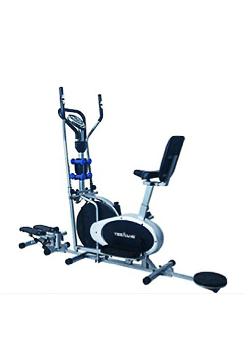 • Presenta dos juegos de mancuerdas de 2 y 3 lb en acero y forrados en plástico, ubicadas en un soporte. Rueda de cintura “twister” plegable. Escalador “mini stepper” con monitor, el cual es retirable. Mangos forrados en caucho con lectores hand-gript para ritmo cardiaco. Sistema de protección en plástico de cadena en acero. Sistema de ajuste manual del pedaleo.